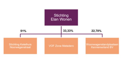 Het schema hieronder geeft een overzicht van de aan stichting Elan Wonen verbonden rechtspersonen.