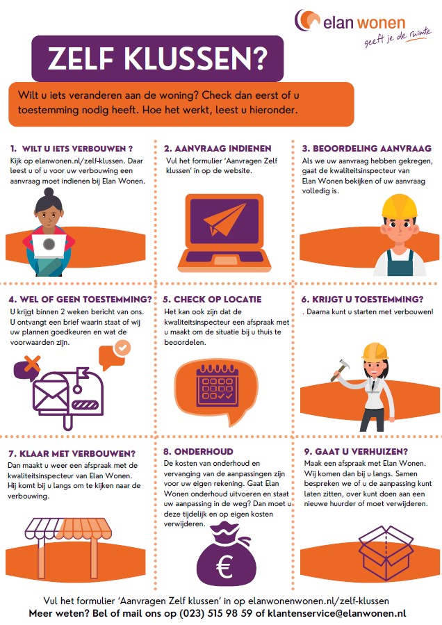 U kunt onze opzichter altijd vragen om langs te komen voor advies. Hij/zij vertelt u of u de klus zelf kunt uitvoeren of dat u beter iemand kunt inhuren. Is het een grote klus en overziet u de mogelijkheden niet? Of wilt u onze hulp bij het uitvoeren van de klus? Wij geven u graag advies. Wij komen langs en nemen graag alle mogelijkheden met u door. Neem hiervoor tijdens kantooruren contact met ons op via (023) 515 98 59 of klantenservice@elanwonen.nl